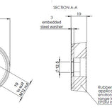 This rubber foot has a fully enclosed and bonded load bearing disc, and a 19mm hexagonal recess underneath to accept a standard M12 bolt head.