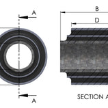 A better solution, therefore, is to increase the rubber wall thickness on the bush, which allows for greater levels of deflection in all axes. To maintain suspension alignment, it is important to maintain higher spring rates radially and conically (the axial spring rates are rarely relevant due to other forms of constraint). This radial and conical spring rate is increased by effectively reducing the rubber 'height' in these directions through adding the intermediate tube.